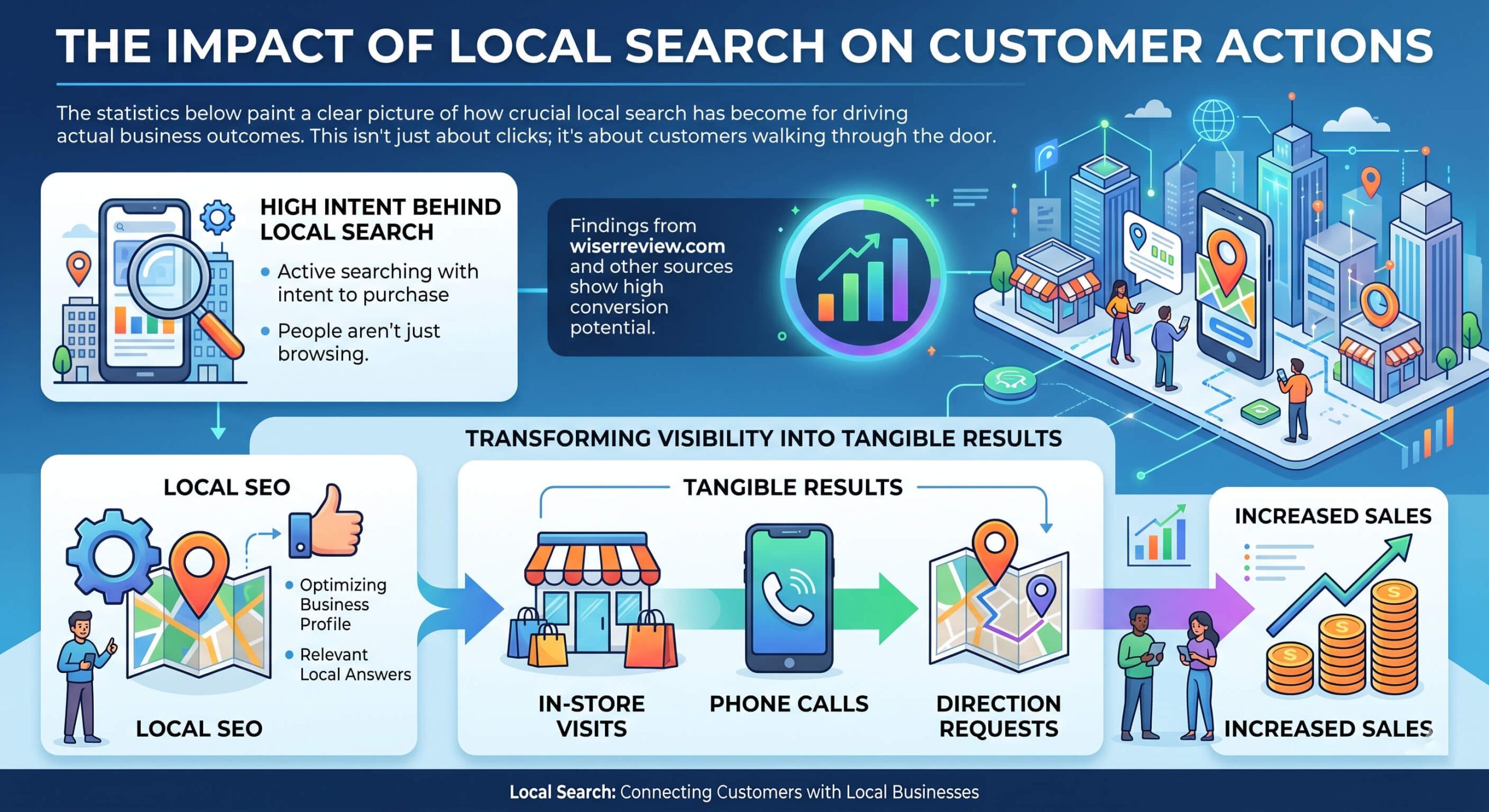 These numbers, including findings from wiserreview.com, show that the intent behind a local search is incredibly high. People aren’t just browsing; they are actively looking to make a purchase.