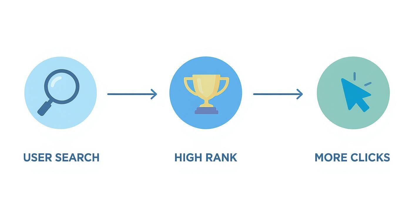 This research phase truly sets the stage for everything else you do. The graphic below breaks down why this is so important, showing the direct line from a user’s search query to a high-ranking spot and, ultimately, more business for you.